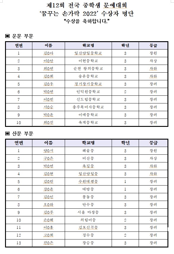 Á¦12ȸ ÁßÇлý ¹®¿¹´ëȸ '²Þ²Ù´Â ¼Õ°¡¶ô 2022' ¼ö»óÀÚ ¸í´Ü