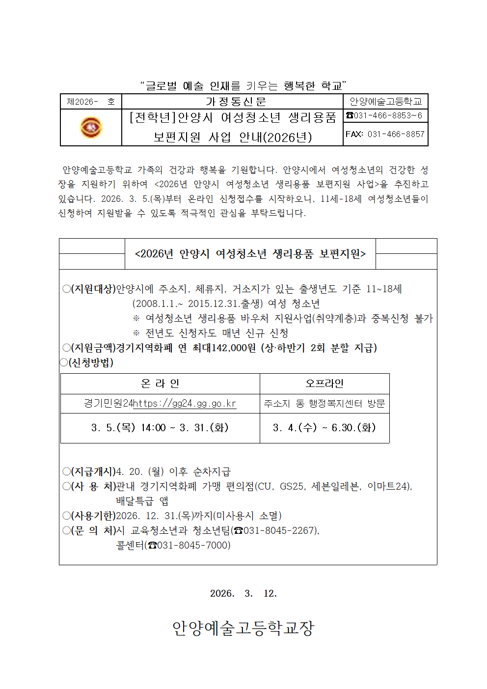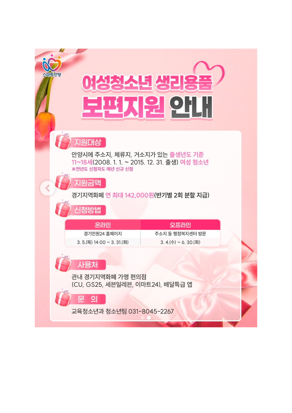 [ÀüÇгâ]¾È¾ç½Ã ¿©¼ºÃ»¼Ò³â »ý¸®¿ëǰ º¸ÆíÁö¿ø »ç¾÷ ¾È³»(2026³â)