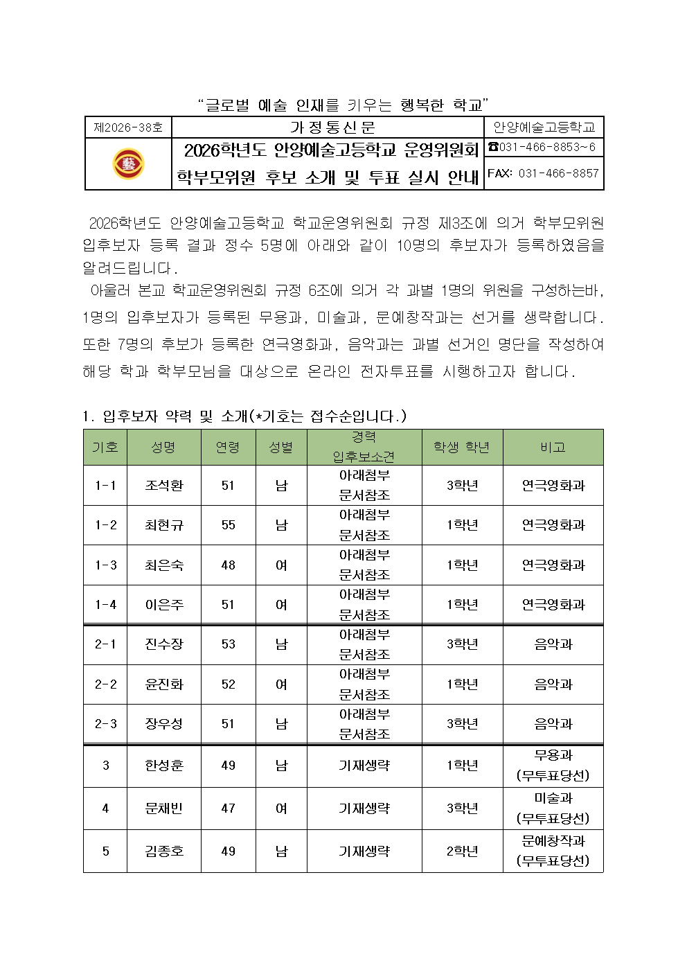 ¾È¾ç¿¹¼ú°íµîÇб³ ¿î¿µÀ§¿øÈ¸ ÇкθðÀ§¿ø Èĺ¸ ¼Ò°³ ¹× ÅõÇ¥ ½Ç½Ã ¾È³»