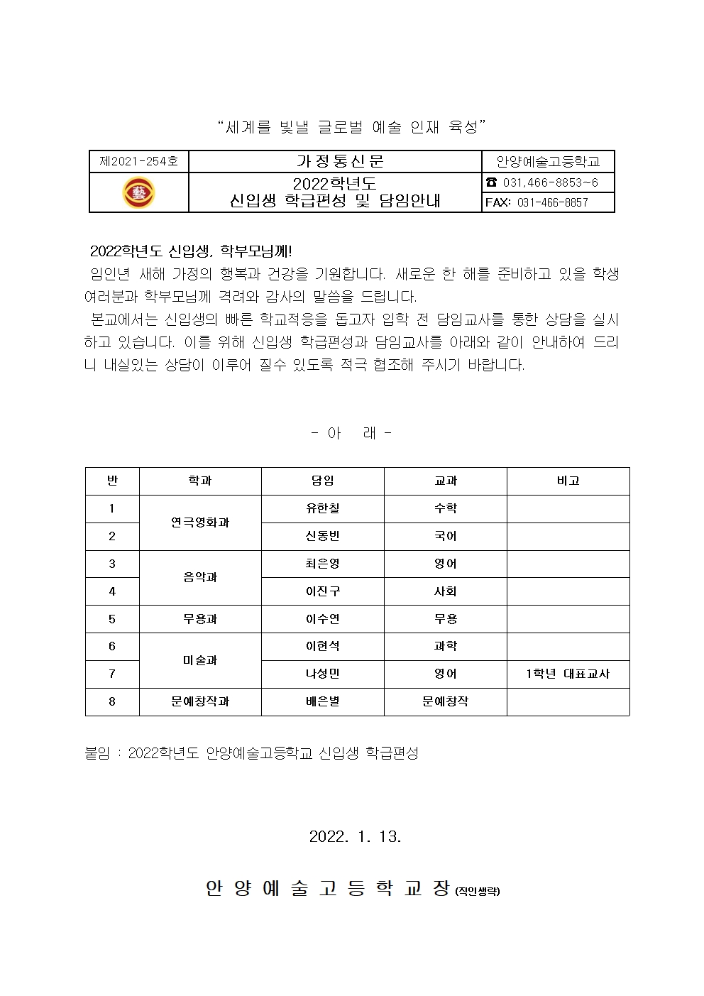 2022Çг⵵ ½ÅÀÔ»ý ÇÐ±ÞÆí¼º ¹× ´ãÀӾȳ» °¡Á¤Åë½Å¹®