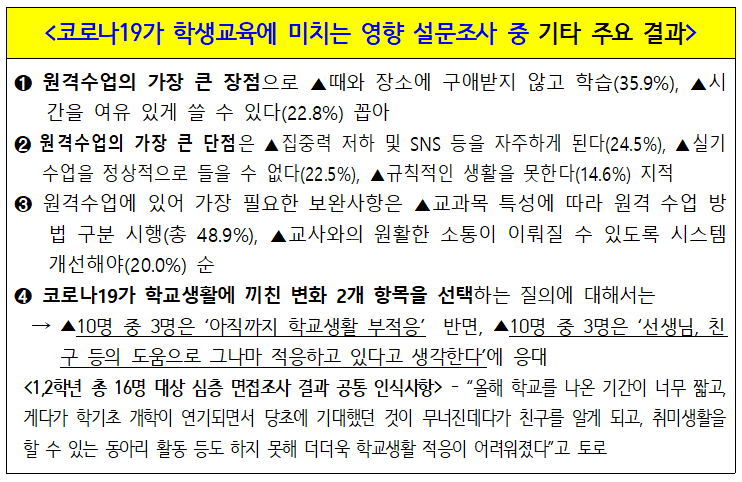 6. ³¡À¸·Î, À̹ø ¼³¹®À» ±âȹ°úÁ¤ºÎÅÍ Á÷Á¢ ÃѰýÇÑ È²¿µ³² ±³ÀåÀº “Äڷγª19°¡ ÇлýµéÀÇ ±³À°ÀÏ»ó¿¡ ¹ÌÄ¡´Â ¿µÇâÀº ¾ÆÁ÷±îÁö´Â ±³»çµéÀÌ ÁüÀÛÀ¸·Î¸¸ ¿¹»óÇϰí, ´ëÀÀÇϰí ÀÖ´Â ¼öÁØÀÌ´Ù. ±×·¯³ª ÄڷγªÀÇ ½ÇÁ¦ ¿µÇâÀº ¿¹»óº¸´Ù ÈξÀ ´õ Çлýµé¿¡°Ô ¸¹Àº ¿µÇâ°ú º¯È¸¦ ÀÏÀ¸Å°°í ÀÖÀ½À» È®ÀÎÇÒ ¼ö ÀÖ¾ú´Ù”¸ç “¼³¹®½Ç½Ã¿Í °á°ú°¡ ¸ðµÎ ±³À°ÀûÀ¸·Î Å« Àǹ̰¡ ÀÖ¾î Çб³¿¡¼´Â, Çб³±³À° °úÁ¤¿¡ ÀÖ¾î ÇлýµéÀÇ ÀÏ»ó»ýȰ »Ó¸¸ ¾Æ´Ï¶ó Á¤¼ÀûÀÎ ¿äÀαîÁö Æ÷ÇÔÇÏ¿© ¼¼¹ÐÇÏ°Ô ¹Ý¿µ‧¿î¿µÇØ ³ª°¥ °èȹÀÌ´Ù”¶ó°í °Á¶Çß´Ù.