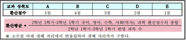 - 2Çгâ 1, 2Çбâ, 3Çгâ 1ÇбâÀÇ °ú¸ñº° ¼ºÃëµµ(A-B-C-D-E)¿¡ µû¸¥ ȯ»êÁ¡¼ö¸¦ ´ÙÀ½°ú °°Àº ¹æ¹ýÀ¸·Î Àû¿ëÇÏ¿© ȯ»êÆò±ÕÀ» »êÃâÇÑ ÈÄ, <Ç¥1>ÀÇ µî±Þº° ±Þ°£¿¡ ÇØ´çÇÏ´Â Á¡¼ö¸¦ ¹Ý¿µÇÑ´Ù. (3Çгâ 2Çб⠼ºÀû ¹Ì¹Ý¿µ)